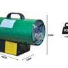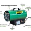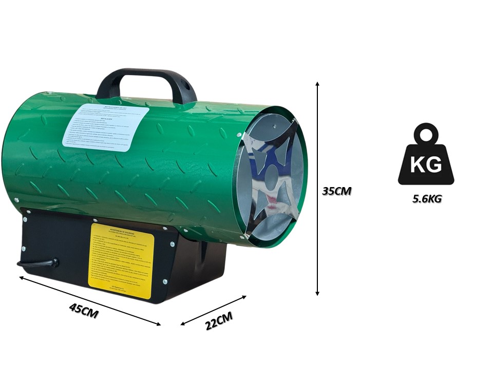 Cuenta con un turboventilador alimentado eléctricamente (220V) que asegura un flujo de aire constante de 630 m³/h, optimizando la distribución del calor. Su estructura robusta y liviana (solo 5,6 kg) permite un fácil transporte y manipulación. Además, posee protección IPX4, ideal para entornos con humedad moderada.
