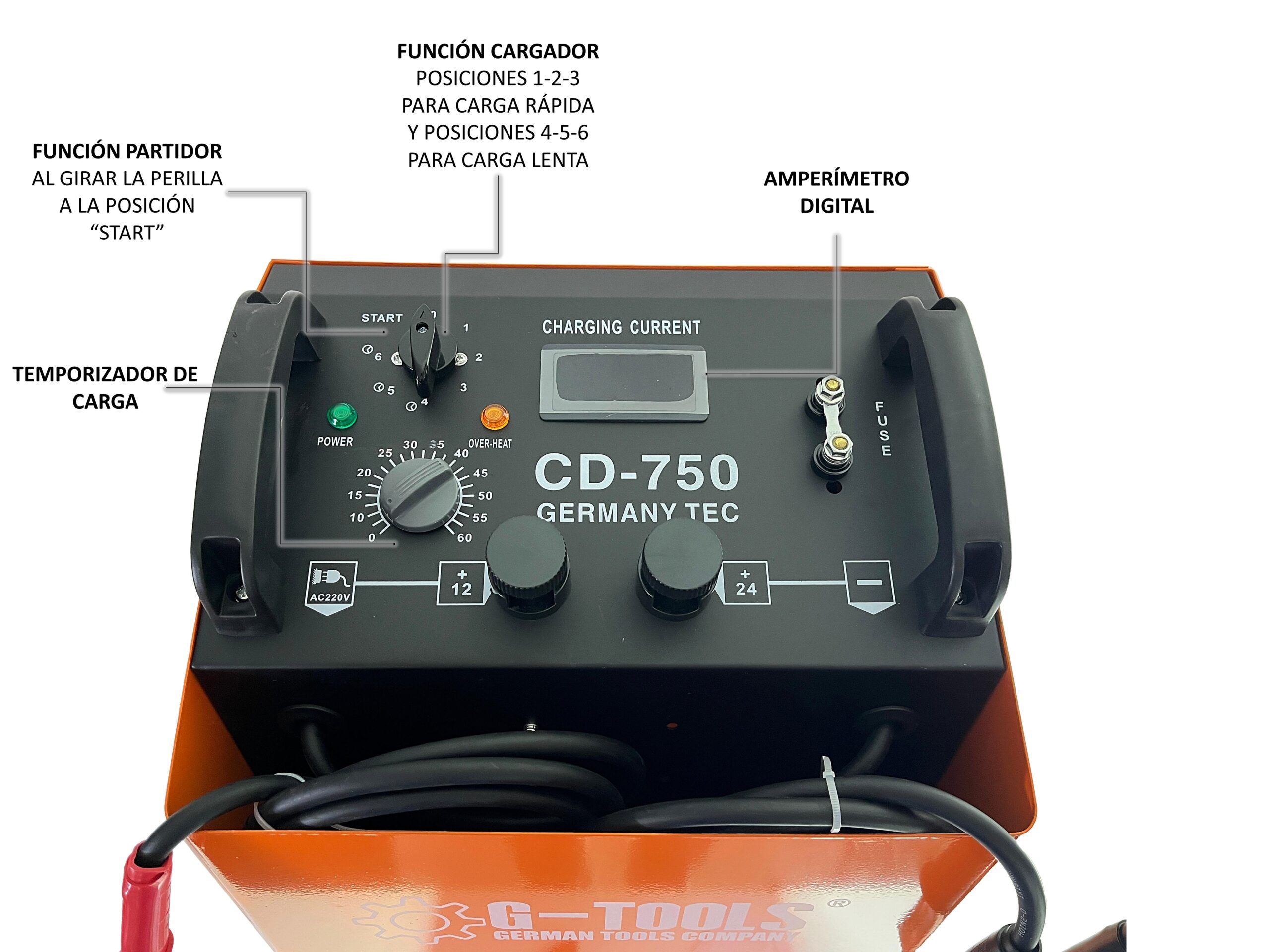 -Accesorios: cable de carga (2.0 + 2.0) m, dos abrazaderas, fusible intercambiable.