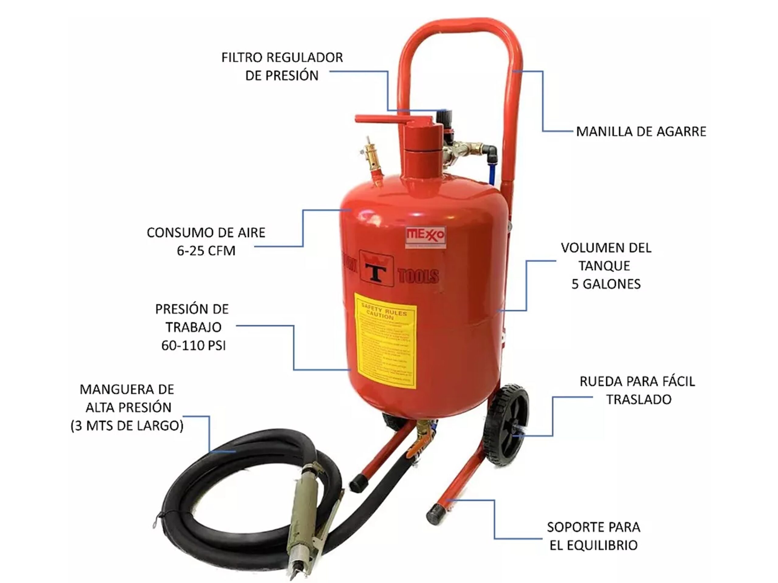 CON SU CAPACIDAD DE TANQUE, LONGITUD DE MANGUERA, PRESIÓN DE TRABAJO AJUSTABLE Y CONSUMO DE AIRE ADECUADO, ES UNA HERRAMIENTA VERSÁTIL QUE ENCUENTRA APLICACIONES EN DIVERSAS INDUSTRIAS Y PROYECTOS DE LIMPIEZA Y PREPARACIÓN DE SUPERFICIES.