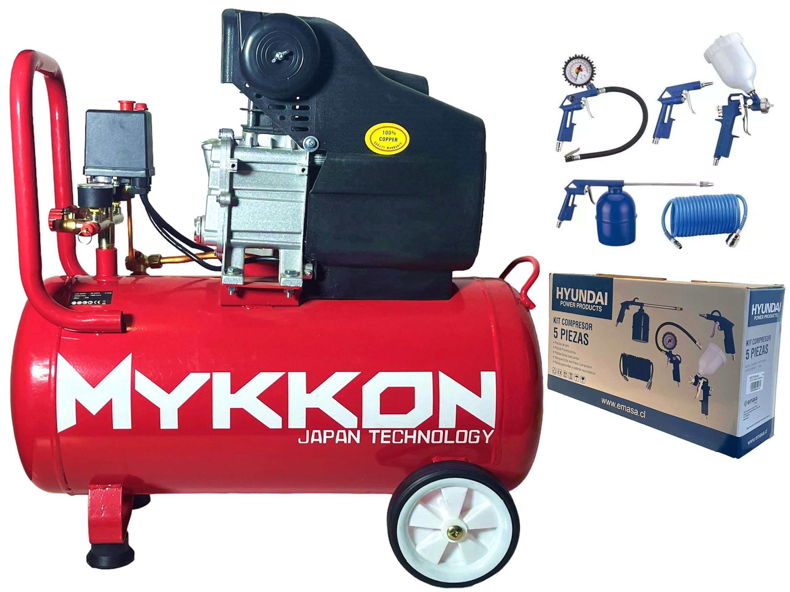 APROVECHA NUESTRA OFERTA POR TIEMPO LIMITADO EN LA QUE TE LLEVAS UN KIT DE COMPRESOR DE 5 PIEZAS DE LA PRESTIGIOSA MARCA HYUNDAI INCLUIDO EN LA COMPRA DEL COMPRESOR DE 50L MYKKON