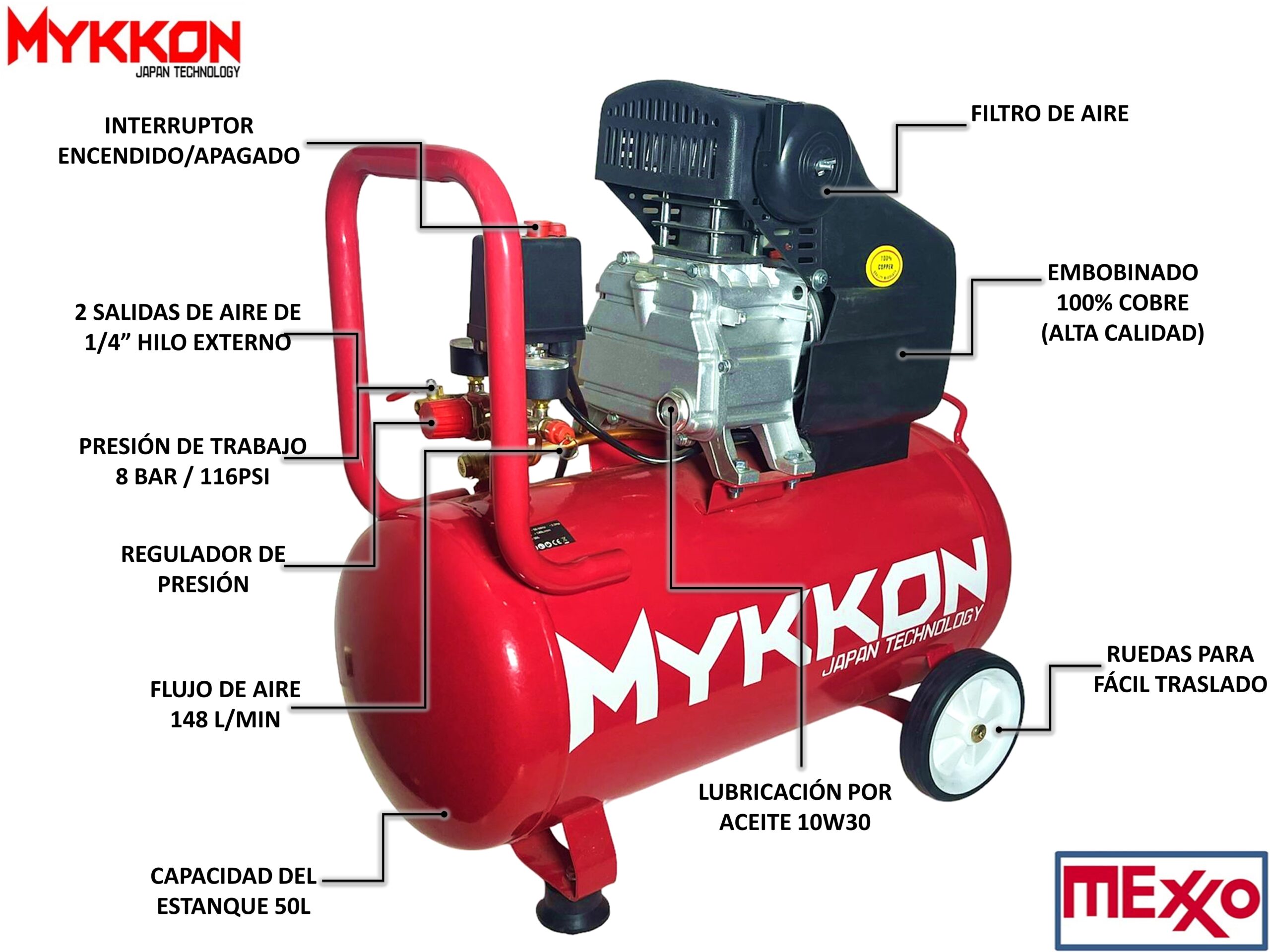 Compresor de aire 2.5 Hp, 50 Lts. marca MYKKON