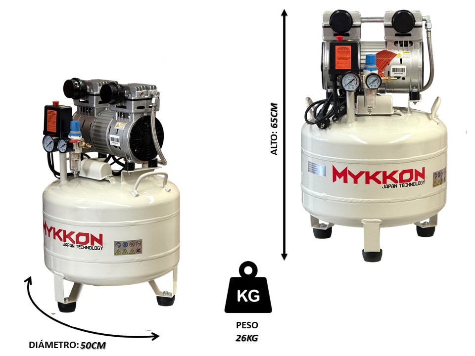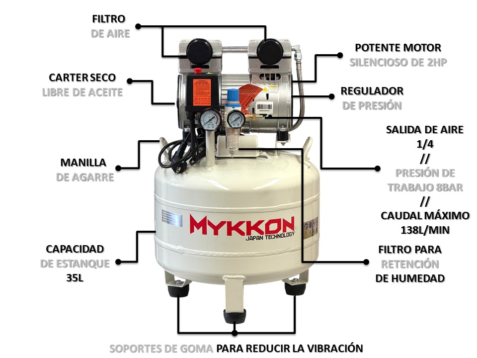 COMPRESOR SILENCIOSO 2HP, 35 LITROS MYKKON JAPON, TECNOLOGÍA CARTER SECO (OIL LESS)