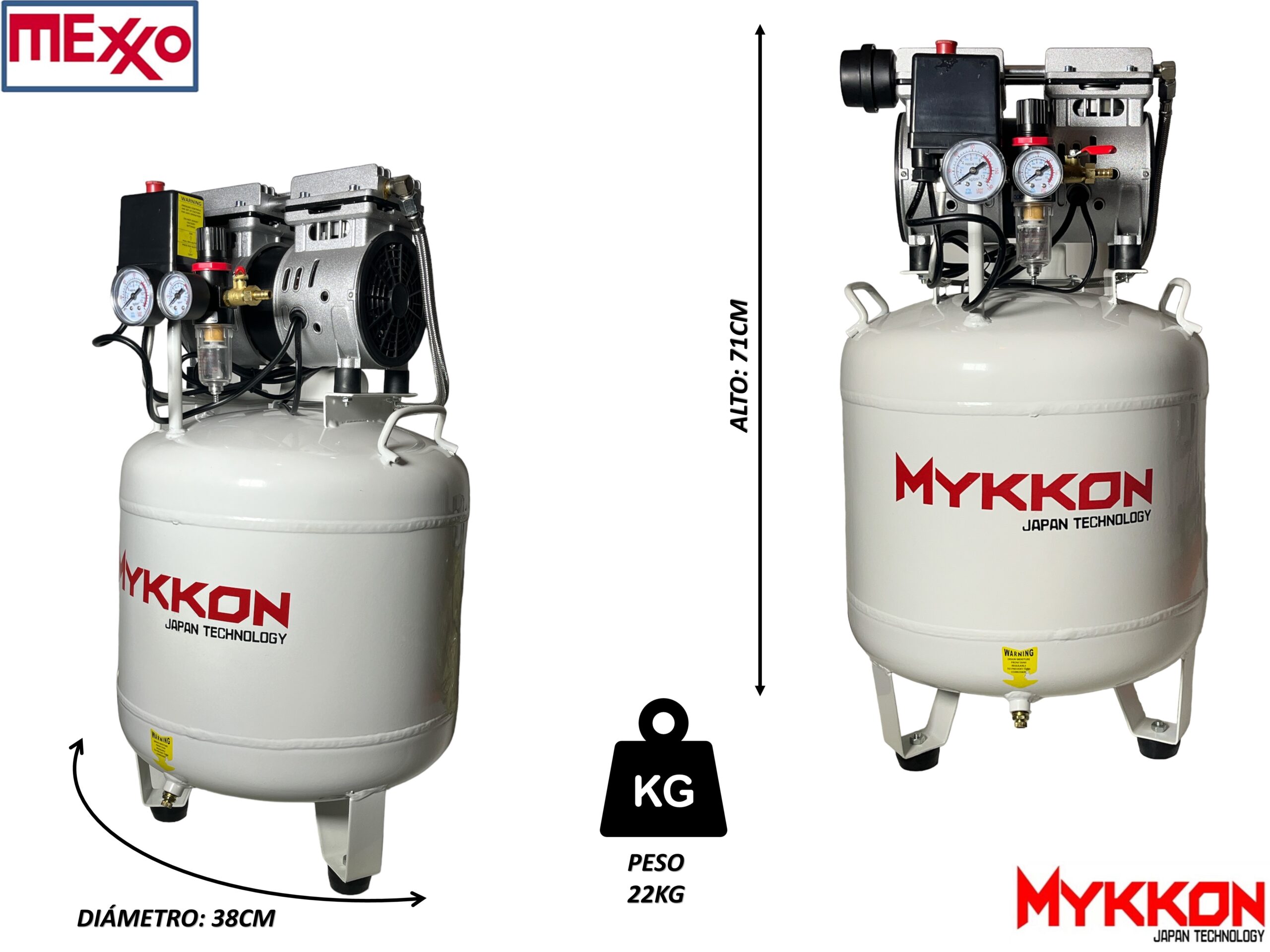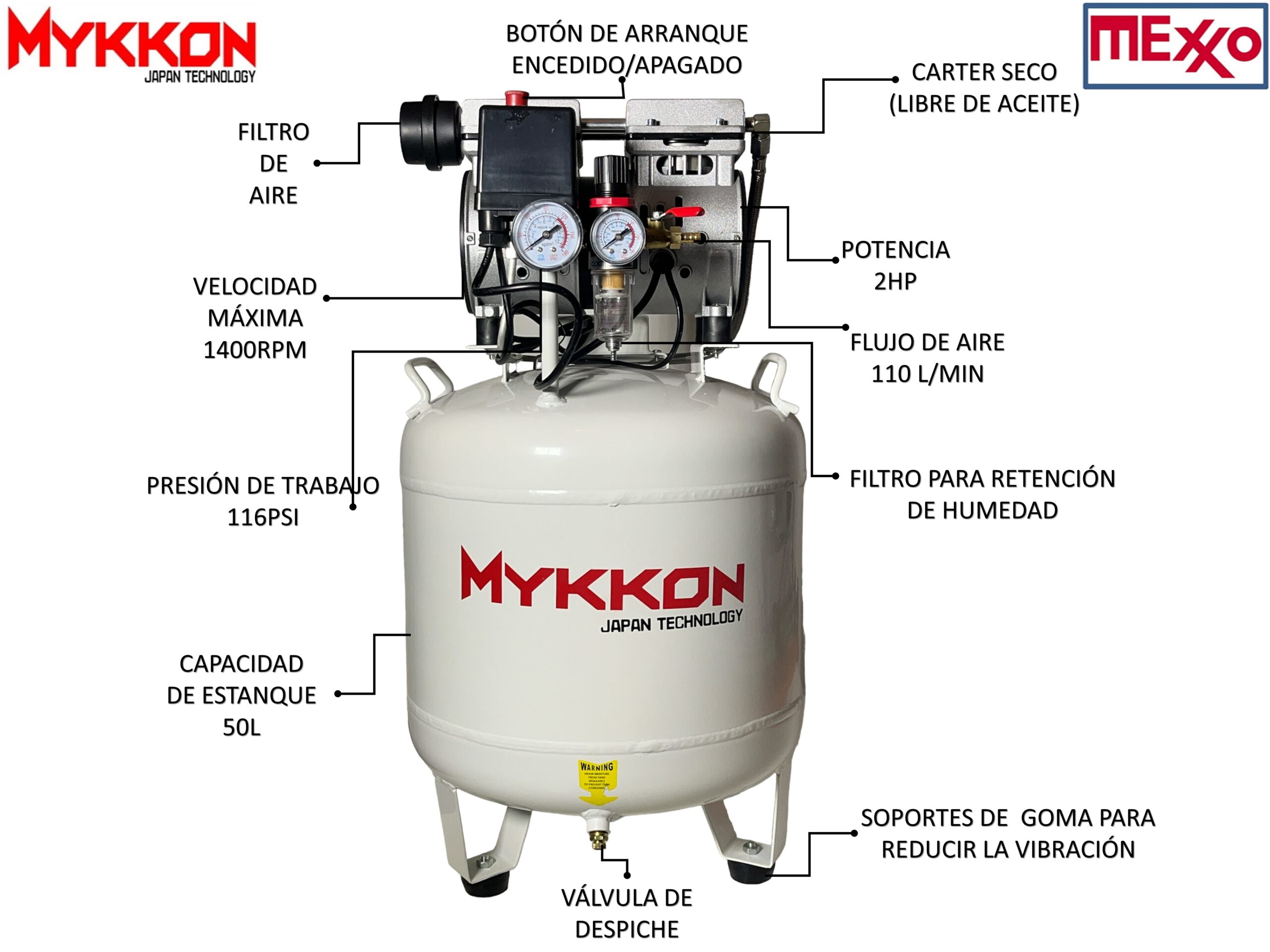 COMPRESOR SILENCIOSO 2HP, 50 LITROS MYKKON JAPON SILENT, CARTER SECO (OIL LESS)