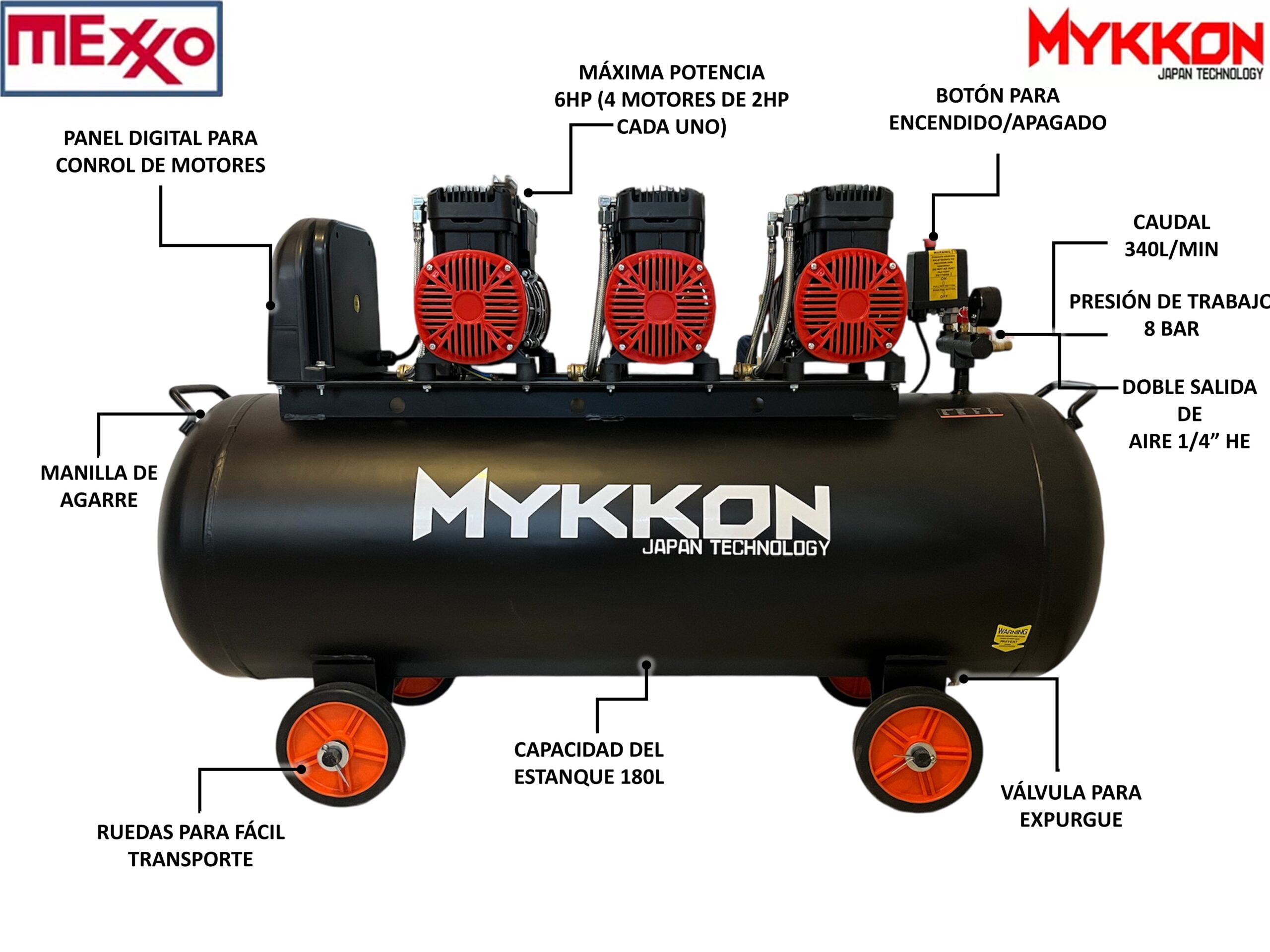 COMPRESOR SILENCIOSO 6HP, 180 LITROS MYKKON JAPON, TECNOLOGÍA CARTER SECO (OIL LESS)