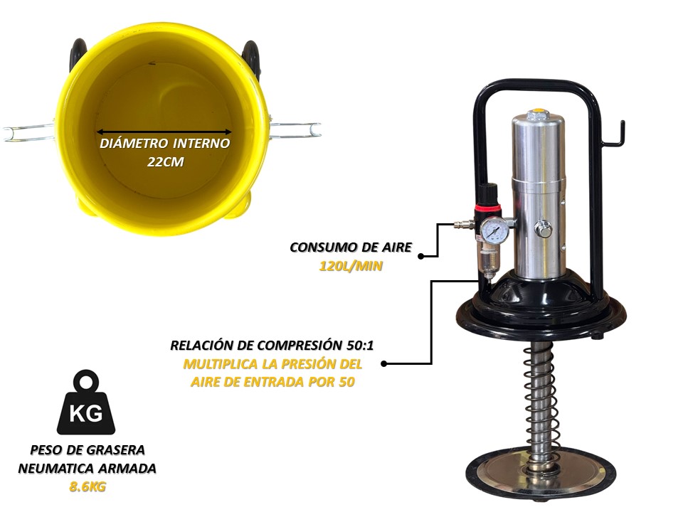 Gracias a su relación de compresión 50:1 y su presión de funcionamiento de 5 a 8 bar (72 – 116 psi), este equipo asegura un suministro uniforme de grasa, incluso en condiciones de trabajo exigentes. Además, su caudal libre máximo de 800 g/min facilita la lubricación de maquinaria pesada, rodamientos, vehículos de carga y equipos industriales con un desempeño superior.