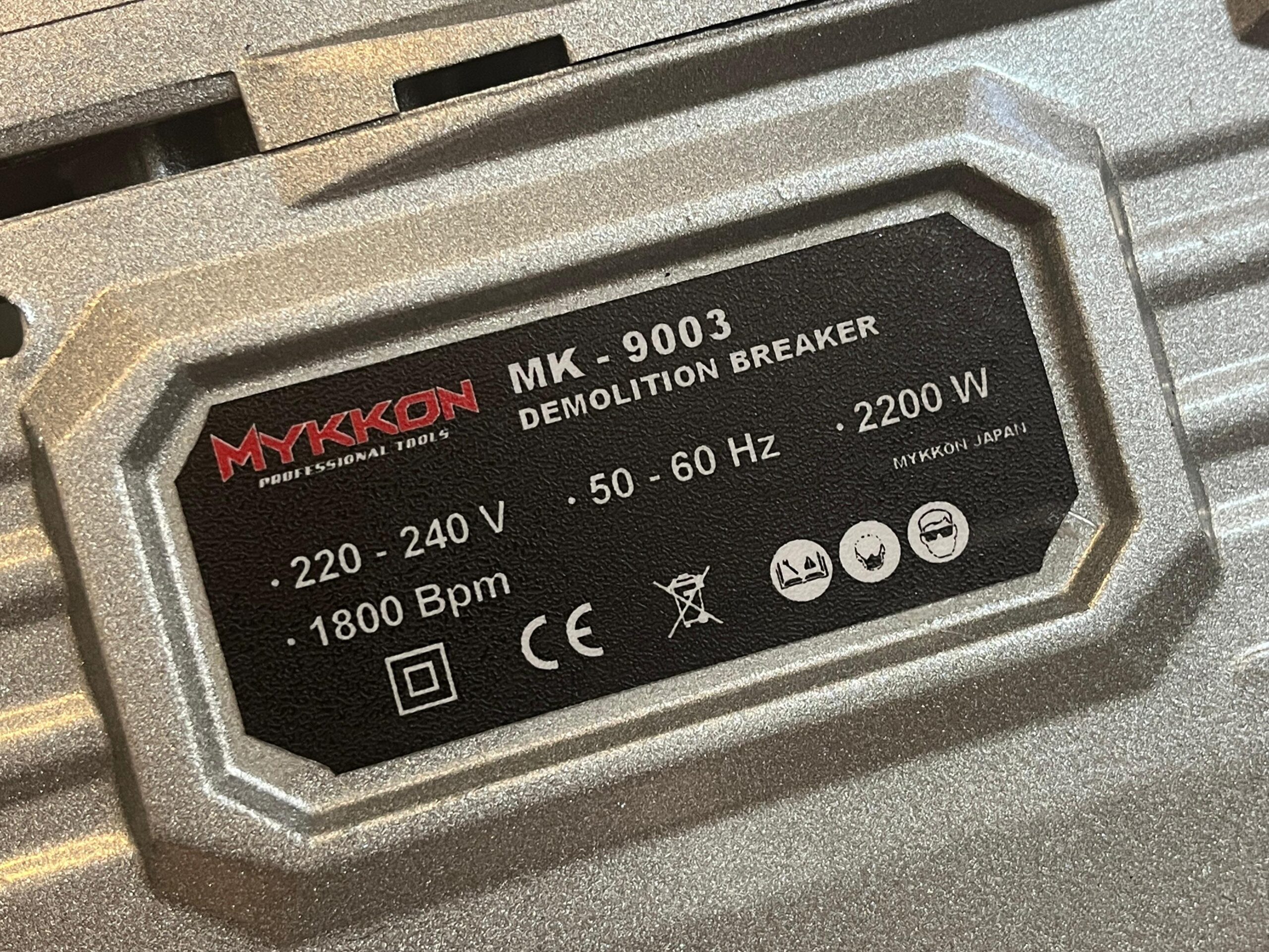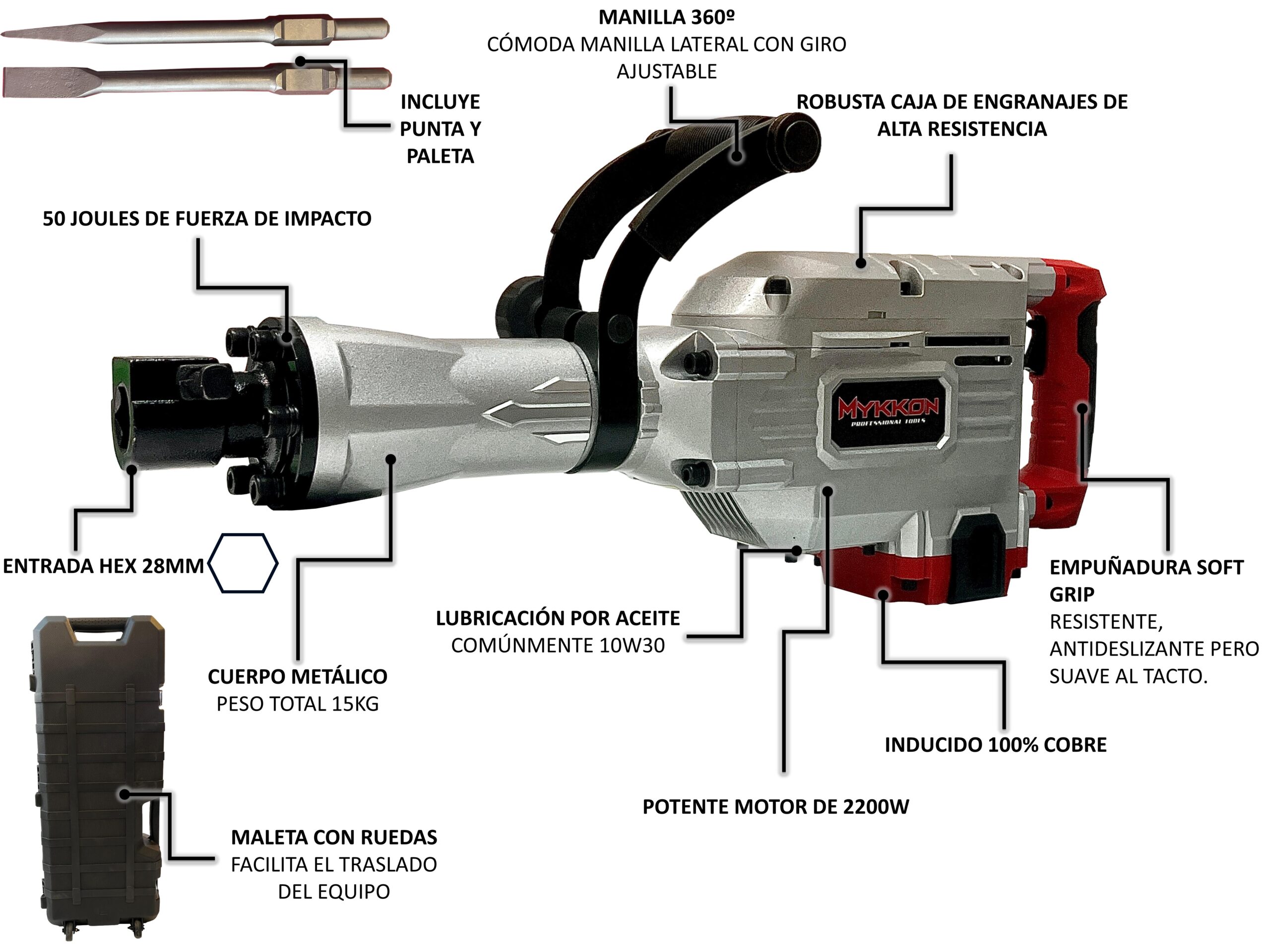 MARTILLO DEMOLEDOR USO PROFESIONAL 2200 WATTS 15 KILOS 50 JOULES DE FUERZA DE IMPACTO MARCA MYKKON
