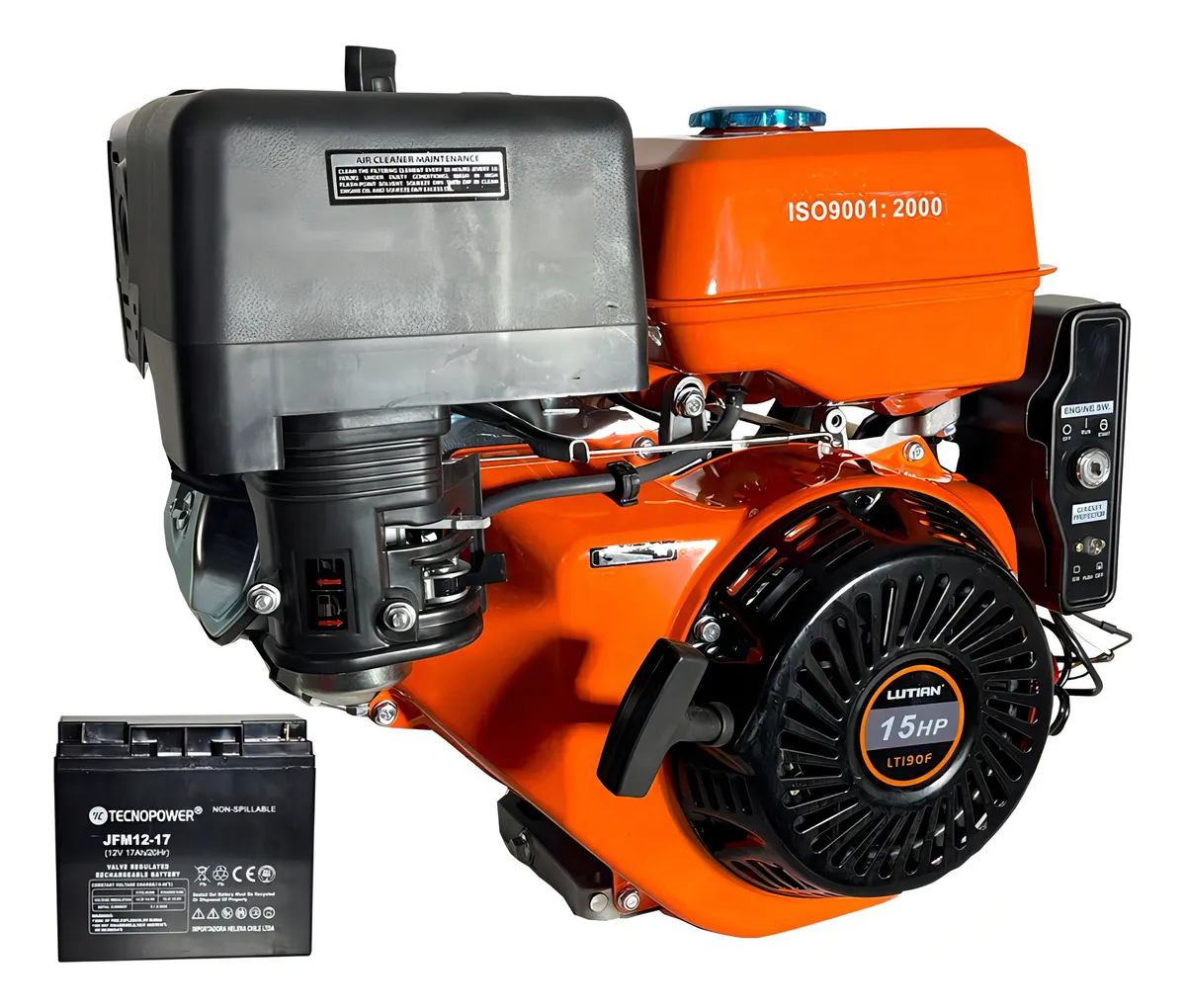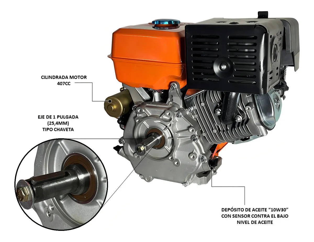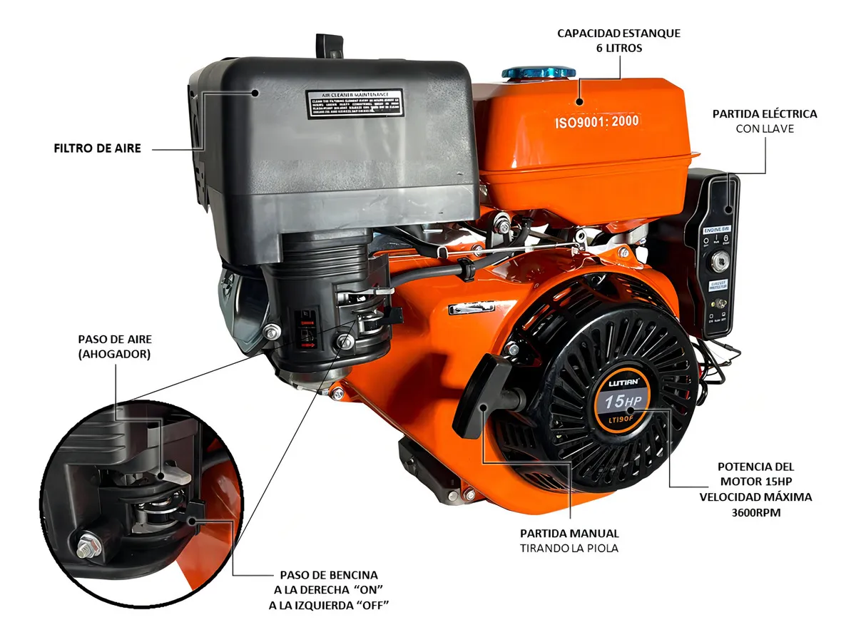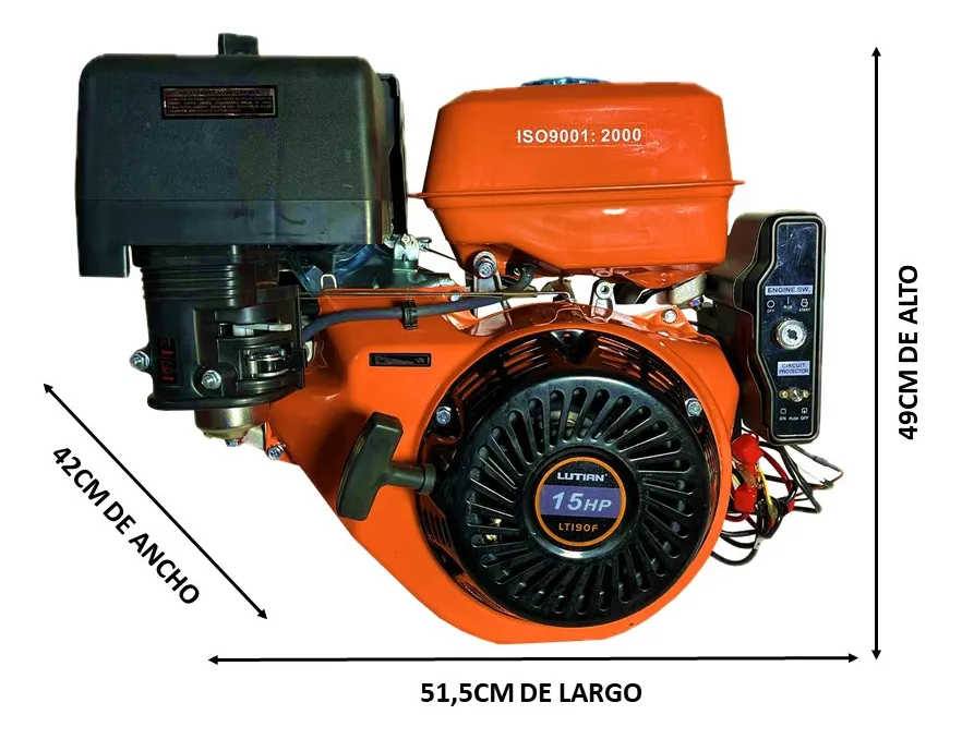 Marca: Lutian Modelo: LT190F Potencia: 15 HP RPM: 3600 Cilindrada del motor: 407 cc Motor: 4 tiempos Diámetro del eje: 25,4 mm (1 pulgada) Tamaños: Eléctrico y manual (con llave y cuerda) Con circuito de protección contra sobrecarga Combustible: Gasolina de 93 octanos Capacidad del tanque: 6 litros Lubricante: SAE 10W-30 Aplicaciones del motor: Pequeñas serrerías, correas transportadoras, molinos de actuación de la unidad hidráulica, trituradores, picadores, entre muchas otras funciones. Incluye batería
