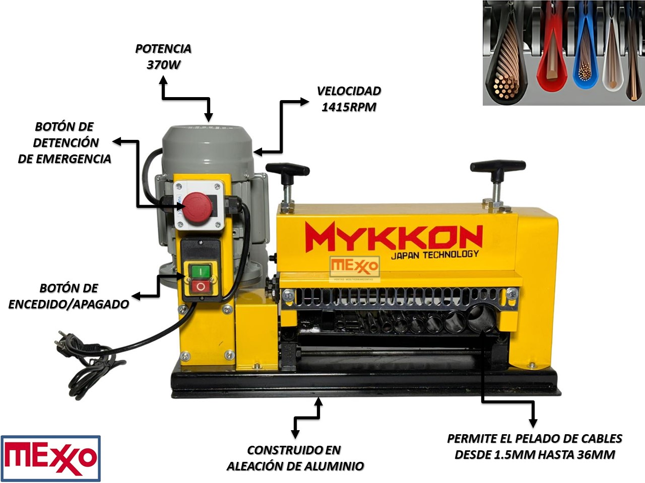 Con su construcción robusta en aleación de aluminio y su diseño ergonómico, el Pelador de Cables Eléctrico Mykkon garantiza durabilidad y facilidad de uso en entornos industriales exigentes.