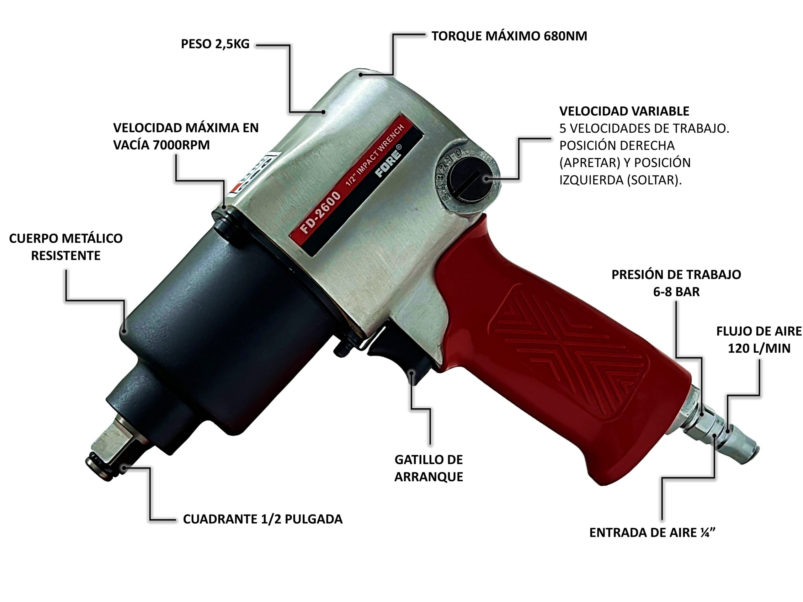 Pistola/llave de impacto cuadrante 1/2 pulgada, 680nm de torque uso profesional (No incluye dados)
