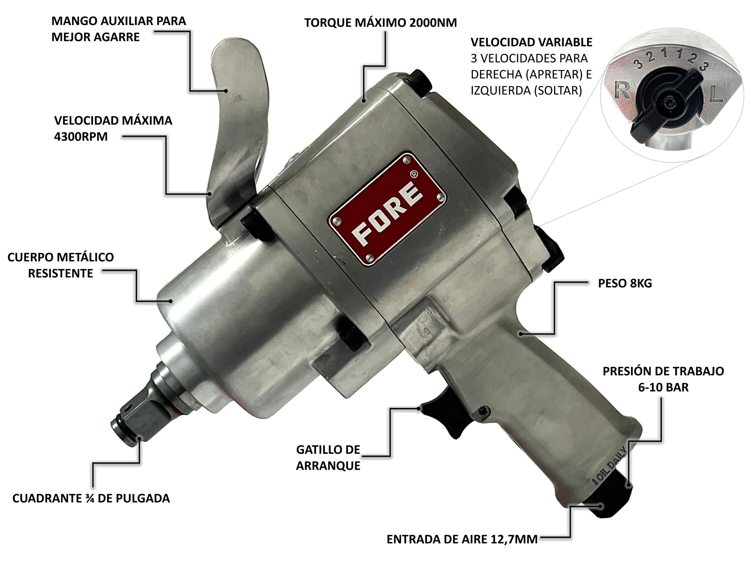Pistola llave neumática 3/4, calidad profesional Fore (No incluye dados)